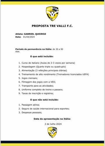 Galera me chamo Gabriel Queiroz, tenho 18 anos, sou atleta, amo Futebol, jogo desde meus 9 anos de idade. Já passei por alguns projetos de futebol onde evoluir o meu potencial, estou almejando o meu sonho que é ser um Jogador Profissional. Recentemente, fiz uma viagem onde participei de um campeonato em São Paulo, onde me destaquei e agora recebi uma proposta do Clube Italiano Palestra Tre Valli F.C. para passar 90 dias em avaliação na Itália, porém eu e minha família não temos condições financeiras de custear todas as despesas, por isso fiz essa vaquinha on-line para que meu Sonho Seja Realizado.