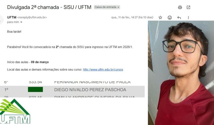 Olá, pessoal! Meu nome é Diego, sou de Jales-SP e venho compartilhar uma grande conquista: fui aprovado em Engenharia Civil na UFTM (Universidade Federal do Triângulo Mineiro)!