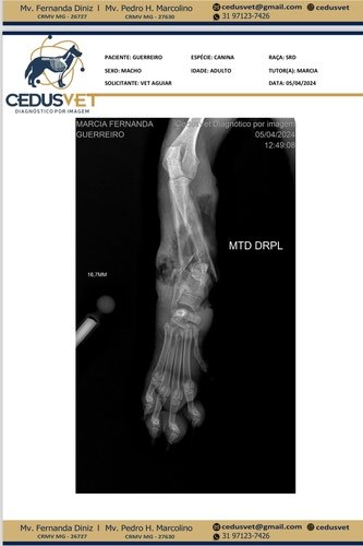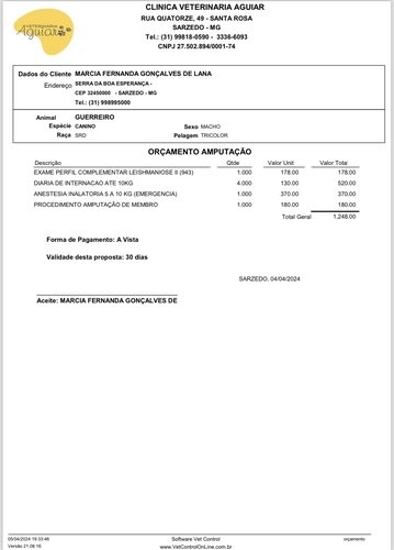 Meu nome é Márcia Lana e acolho o Guerreiro quando ele chegou na minha casa bastante machucado, imediatamente levei-o a clínica veterinária para os primeiros cuidados, Guerreiro estava com febre e gemendo de dor. Ele foi atendido, recebeu as medicações necessárias e fez o raio X, essa primeira parte já foi paga R$680,00 conforme imagem abaixo.