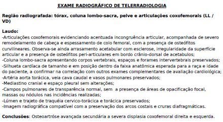 Os exames foram mostrados ao um veterinário ortopedista que concluiu que a melhor opção seria uma operação de denervação articular coxofemural. Valor total: R$4.500,00.