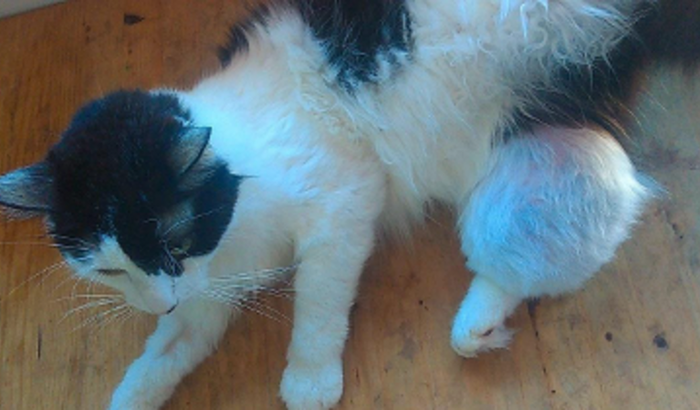 Há cerca de 1 ano ele vem sofrendo com um tumor na perna, que tem aumentado com o tempo. Nesse período ele já consultou com veterinário e com especialista oncológico. Já fez também alguns exames clínicos (hemograma, citologia, radiografia) e tratamento com medicamentos.Inicialmente aparentava ser apenas um cisto, porém, o tumor aumentou significativamente nos últimos meses. Com a comprovação do tumor através de exames, a recomendação do médico oncologista é uma cirurgia de amputação do membro, para que o tumor não se espalhe para o restante do corpo. Atualmente ele tem dificuldade e limitações para caminhar, devido ao tamanho do tumor na perna. Ele também teve grande redução de apetite e consequentemente perdeu muito peso.