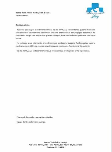 Quem me conhece sabe o quanto eu amo bichinhos, então mesmo morando em Floripa eu abracei a causa dele com todo o meu coração, conversei com meu pai que de prontidão foi levá-lo ao veterinário, chegando lá ao ser examinado João não estava conseguindo urinar provavelmente há dias, então ele passou por atendimento clínico, no dia 27/05/22, apresentando quadro de disúria, sensibilidade e abaulamento abdominal. Durante exame físico em palpação abdominal, foi constatado bexiga com importante grau de repleção, caracterizando um quadro de obstrução uretral. Envolvendo então a sua internação, procedimento de sondagem, lavagens, fluidoterapia e suporte medicamentoso. Além de exames sanguíneos para monitorar a função renal. No dia 30/05/22, a sonda será removida, e avaliaremos a produção de urina espontânea, ou seja saberemos se ele conseguirá urinar sem a sonda. Ele está se alimentando apenas por seringa. João é apenas um bebê, tendo aproximadamente 2 anos, com muito o que viver e merece ser feliz!