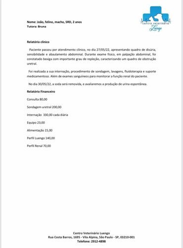 Vou anexar aqui o relatório do quadro clínico dele e os valores. A previsão é que ele saia dia 31/05, porém pode ser que fique mais dias caso ele não consiga urinar sem a sonda e sem que a urina esteja sem sangue por conta da inflamação.