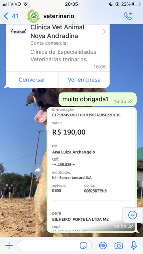 Como moramos numa cidade pequena e sem muito suporte médico e veterinário, fomos transferidas pelo veterinário local para Nova Andradina (MS). Tivemos gastos na consulta + medicamentos para dor (R$ 190). Não temos carro e nossa solução foi pegar uma carona. Gastamos R$ 140 de gasolina, para ajudar a inteirar o valor, pois estávamos indo de favor até o MS.