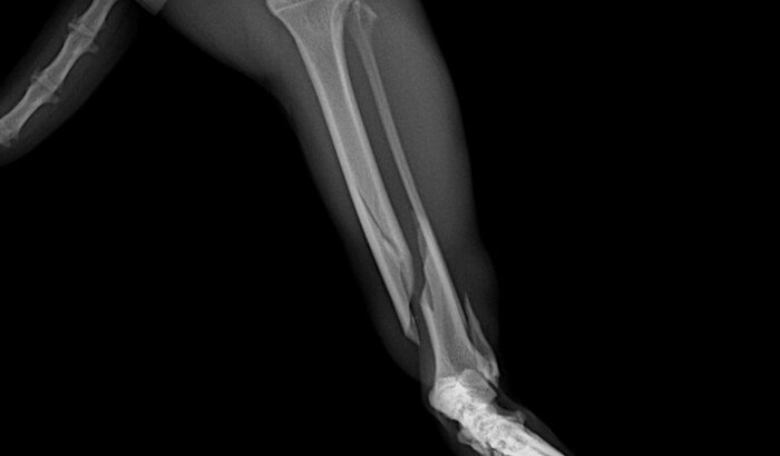 Ele sofreu uma fratura na tíbia, e o raio-X mostrou que ele vai precisar passar por uma cirurgia ortopédica de urgência com pino e placa para recuperar a patinha.