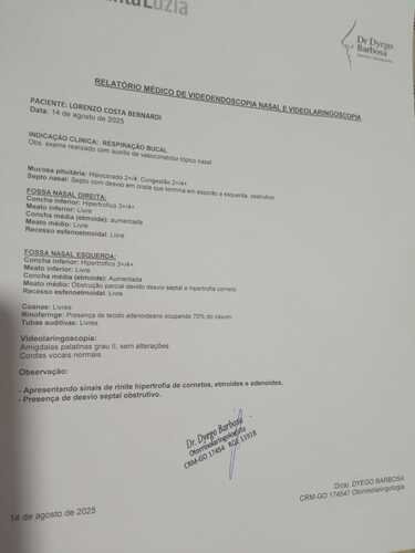 A partir desses problemas ele recebeu um diagnóstico e vai precisar passar por 3 procedimentos cirurgicos, são eles, hipertrofia de cornetos, etmóides e adenóides.