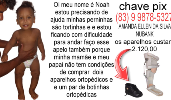 Meu nome é Amanda tenho 25 anos sou mamãe do Noah um BB de 1 ano e 4 meses, o Noah tem as perninhas muito abertas e está prejudicando ele andar eu fui em busca de ajuda e fiz a consulta com um ortopedista ele passou aparelhos noturnos para o Noah como ele tem as perninhas abertas ele passou esse tratamento ele tem uma perninhas mais aberta que a outra estou sem condições no momento.