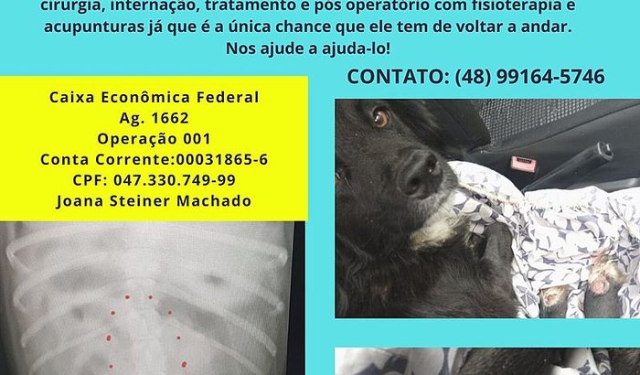 Pepito foi atropelado, não caminha e está com feridas e escoriações pelo corpo além de uma luxação nas vértebras l1 e l2. Precisamos de ajuda para sua cirurgia, internação, tratamento e pós operatório com fisioterapia e acupunturas já que é a única chance que ele tem de voltar a andar.