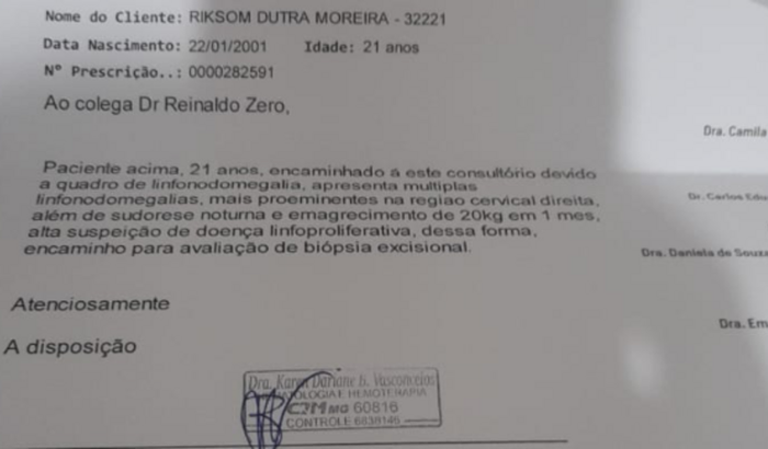 Olá amigos! Venho por meio desta rede social pedir ajuda para meu primo Rikson que foi diagnosticado com linfoma hodgking,uma doença no sangue que necessita de tratamento imediato devido a sua evolução.Ele precisará fazer exames específicos e tratamento