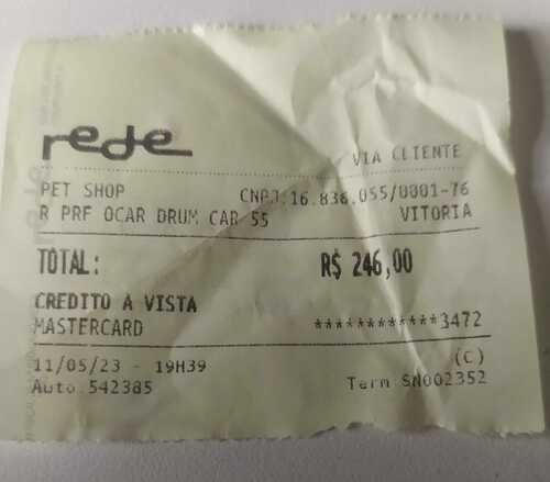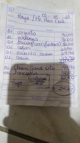 Na Imagem acima temos o recibo da segunda vez no veterinário ,sorte que a veterinária nos deu um desconto.