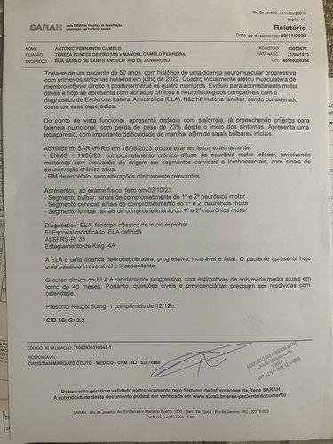 Eu sou o Fernando, sou portador de Esclerose Lateral Amiotrófica, mais conhecido como ELA. É uma doença que afeta o sistema nervoso de forma degenerativa e progressiva e acarreta paralisia motora irreversível. Os sintomas incluem endurecimento dos músculos e perda dos movimentos, resultando na atrofia dos músculos do corpo. Em estados mais avançados pode causar insuficiência pulmonar, perda de peso, incapacidade de cuidar de si mesmo e de respirar sozinho. Infelizmente já estou experienciando estes sintomas e não possuo condições financeiras para arcar com o tratamento e nem para comprar os aparatos necessários para diminuir a evolução da doença e ter o mínimo de qualidade de vida.