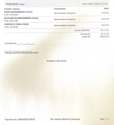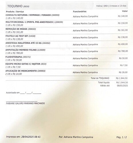 O tratamento completo vai custar R$ 2.178,50 aproximadamente, considerando os cuidados com a infecção (R$ 161,00), a cirurgia de amputação (R$ 1.783,50) e o pós-operatório (R$ 234,00, incluindo 2 dias de internação e aplicação dos medicamentos). Seguem imagens com o orçamento detalhado: