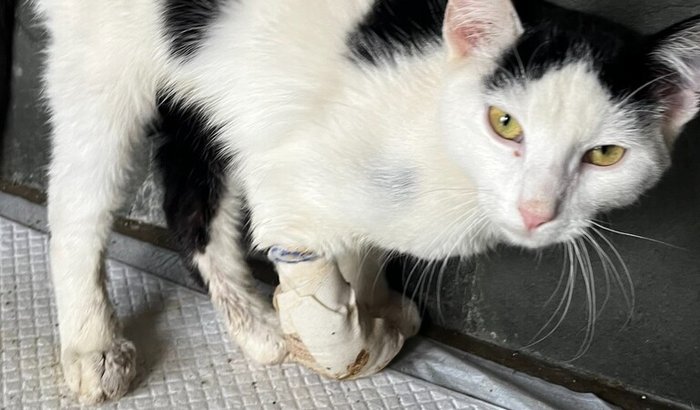 Resgatamos o Toquinho, um gatinho na rua, com aproximadamente 5 meses. Infelizmente, ele sofreu um acidente e teve uma das patinhas arrancada, culminando numa fratura exposta e, consequentemente, num quadro de bicheira. Ele se aproximou com muita dor, pedindo ajuda e nós o levamos ao veterinário. Além do tratamento da miíase, ele vai precisar amputar a perninha pra ficar bom e evitar maiores complicações.
