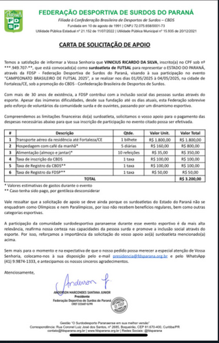 Vinícius é um atleta surdo da cidade de maringá, praticante de Futsal, têm se destacado na modalidade e foi convocado pela seleção paranaense de futsal para um campeonato na cidade de Fortaleza! Precisamos da sua ajuda para que ele consiga representar o nosso estado nesse campeonato! Qualquer ajuda é bem vinda!