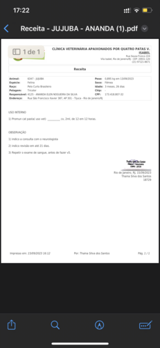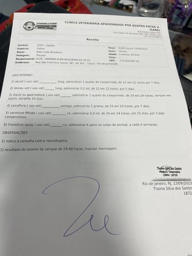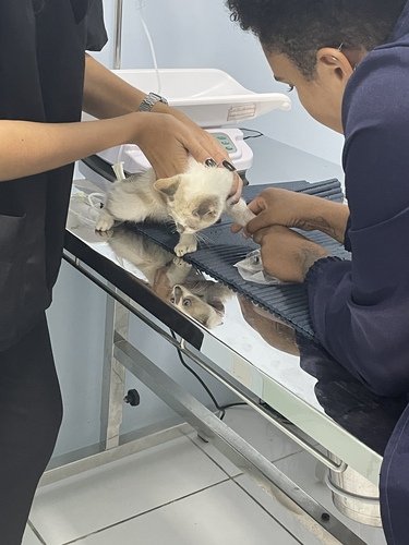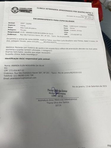 Jujuba é um filhote felino de +- 3 meses de idade, fêmea, SRD. Estava presa no telhado de nossa vizinha (terceiro andar), chegou a cair duas vezes e voltava para o telhado, até que conseguimos resgata-lá no dia 30/08/2023. No dia 11/09/2023 Jujuba início um quadro de diarreia e vômito e no dia 13/09/2023 parou de comer, daí em diante começou nossa verdadeira corrida para ajudá-la. Pegamos um cartão emprestado e levamos ela ao vet, onde foi diagnosticado lesão neurológica, foi testada Fiv e Felv e graças a Deus deu negativo, mas mesmo o exame de sangue deu leucopenia e linfopenia absoluta. Nossa luta agora vai ser pagar as despesas com o veterinário, comprar os remédios necessários para recuperação e levá-la ao neurologista para ser identificado o real problema neurológico e poder ajudar nossa jujubinha da melhor forma possível para poder ter uma vida tranquila. Contamos com a ajuda de todos, nós e jujubinha agradecemos cada um ❤️🩹