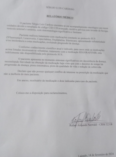 Meu pai vem realizando tratamento contra seu segundo câncer, sendo que a medicação disponibilizada pelo SUS não deu retorno ao tratamento.