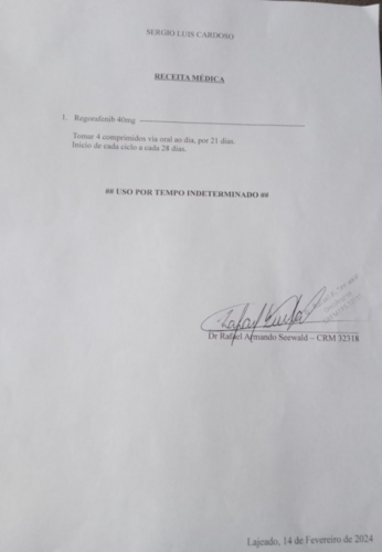 Olá, eu sou a Luana Cardoso, filha do Sérgio Luis Cardoso de Arroio do Meio/RS.Meu pai vem realizando tratamento contra seu segundo câncer, sendo que a medicação disponibilizada pelo SUS não deu retorno ao tratamento.Estamos buscando desde ver tudo