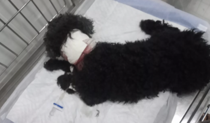 Spith é um poodle de porte pequeno, tem 10 anos e foi atacado por um cachorro de porte grande misturado com pitbull. Ele foi ferido na região do pescoço e precisa passar por uma cirurgia na traqueia.