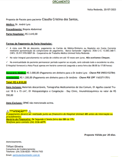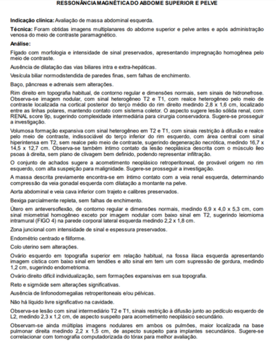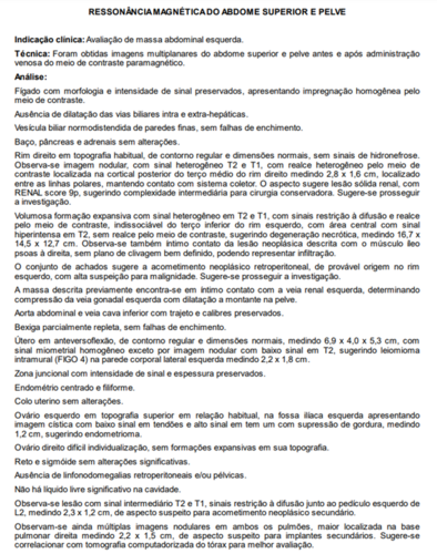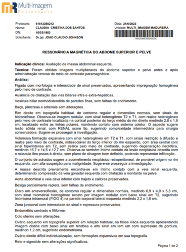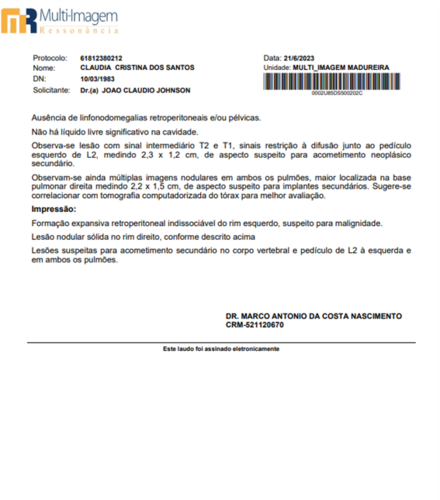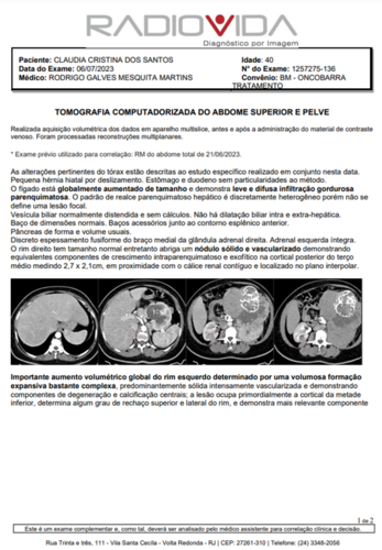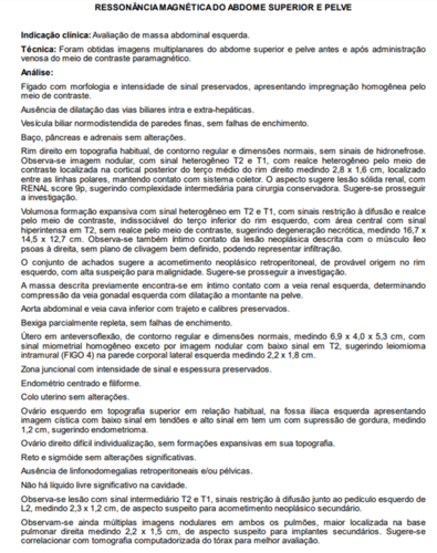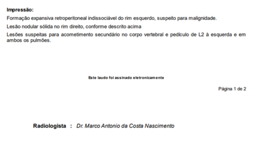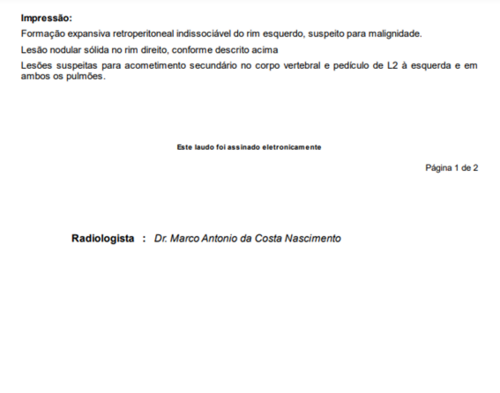 Infelizmente, em Maio, uma funcionária do berçário muito querida por todos, vinha perdendo peso e sentindo algumas dores. Logo, eu Paula, pedi que procurasse a UPA para ser avaliada. Assim a mesma fez, e foi orientada à procurar a clínica da família sem um diagnóstico definido. Chegando à clínica da família, realizou exames de sangue e urina, onde foi constatado uma anemia profunda e suspeita de sangue na urina. Efetuaram o cadastro no Sisreg e pediram que aguardasse, sendo que, não satisfeita com a espera, levei a mesma para fazer tudo no particular (segue exames em imagem), no qual foi fator surpresa para nós o laudo revelado pelo médico de um Câncer Raro no rim esquerdo (que hoje mede 20cm) e nódulos em outros órgãos.