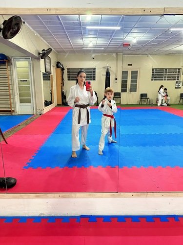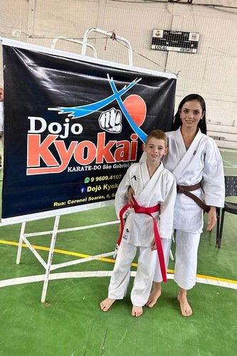 Hoje tenho 8 anos. Hoje sou faixa vermelha de Karatê e iniciei minha trajetória em outubro de 2022 juntamente com minha mãe que também é Karateca.