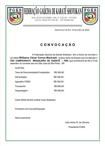 Em julho veio a convocação da FGKS para participar do XXII Campeonato Brasileiro de Karate que este ano será na cidade de São José do Rio Preto- SP nos dias 8-9-10 de Setembro de 2023.