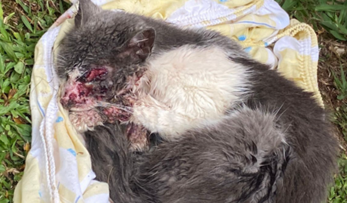 O gatinho apresenta feridas avançadas provocadas pela doença além de desnutrição, desidratação e obstrução de vias aéreas dificultando sua respiração. Sua situação é delicada mas estamos fazendo o possivel para salvá-lo.