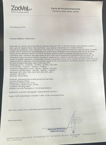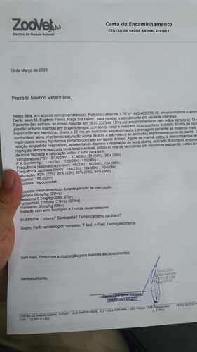 Esse é meu gatinho chamado Derik, recentemente esteve com dificuldade para respirar então levamos ao veterinário, chegando lá descobrimos que ele possui líquidos nos pulmões, fizemos diversos exames e no momento ele está internado e fazendo drenagem, mas ele ainda precisa fazer uma tomografia e ficar dias internado, mas não temos condições de pagar mais dias de internação e exames ( gastamos tudo no veterinário, internação atual e medicamentos) quem puder ajudar agradeço muito.
