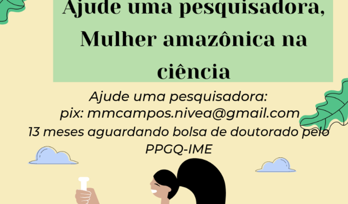 Eu sou a Nívea, proveniente da região Amazônica (Amazonas), estou fazendo o doutoramento pelo PPGQ-IME e quando fiz a seletiva do curso optei por dedicação exclusiva a pesquisa e quem faz essa opção tem direito a receber um auxilio a pesquisa, contudo, eu estou desde 23/07/2021 aguardando ser contemplada com este benefício e como ainda não saiu, eu estou aqui pedindo ajuda para me manter na pesquisa por mais um mês. #MulherAmazônicaNaCiência