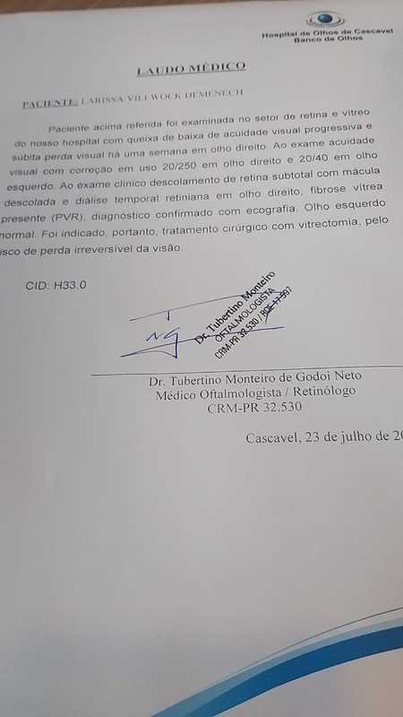 Gente, a filha da minha amiga se chama Larissa Villwock De Menech, tem 21 anos sofreu um trauma ocular, tem miopia de 6 graus e teve deslocamento grave de retina. Necessita de uma cirurgia de emergência, para não ficar cega. O SUS tem fila de espera de anos, se ela ficar por lá, perderá a visão para sempre! A família não tem condições de arcar com o tratamento, já encontram muitas dificuldades no dia a dia! Contamos com a colaboração de todos! A retina é uma fina estrutura de tecido nervoso que reveste a parte interna do olho. Quando parte ou a totalidade da retina se desprende da parte posterior do olho, há o descolamento da retina, no caso de Larissa, foi quase a retina toda! O rasgo permite que o fluido de dentro do olho entre por detrás da retina, fazendo com que ela se descole das demais estruturas intraoculares.Essa separação interrompe o fornecimento de nutrientes e promove a degeneração celular, fazendo com que a visão se perca para sempre!
