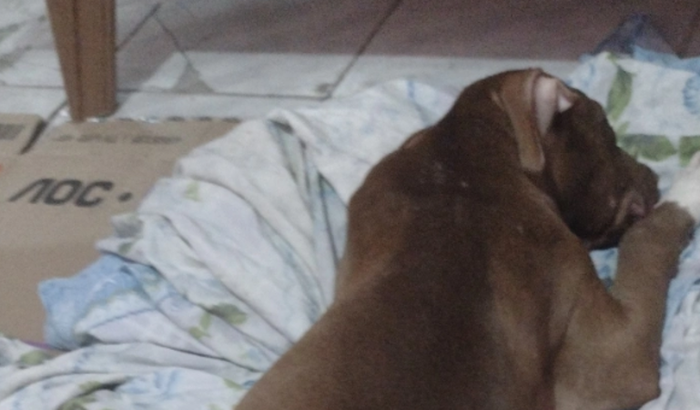 Bom dia pessoal, esse é o Zeus. Ele é um Pitbull e tem somente 4 meses. A duas semanas foi diagnosticado com a doença do carrapato. Durante o tratamento ele teve uma piora e junto com isso acabou contraindo parvovirose.