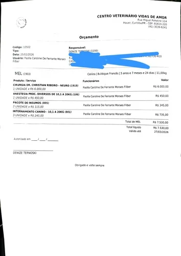 Eu sou Baltazar, tutor da Mel, a bulldog mais fofa do mundo. Ela está internada no Centro Veterinário Vidas de Amor, aqui em Curitiba. Ontem, ela foi internada porque amanheceu sem conseguir mexer as pernas de trás. Hoje ela piorou e eu tive que autorizar uma cirurgia que custa aproximadamente 7500,00, fora mais 1000,00 da tomografia e mais pós-operatório. Ela já apresentava problemas de coluna que estávamos tratando, eu já estourei o limite do cartão e não tenho mais nada, preciso de ajuda urgente. A prestação de contas será de cada centavo, eu só quero salvar a minha gorda. Não sei quanto mais vou precisar, se vou precisar de algo depois, mas a urgência é o agora, é a cirurgia.
