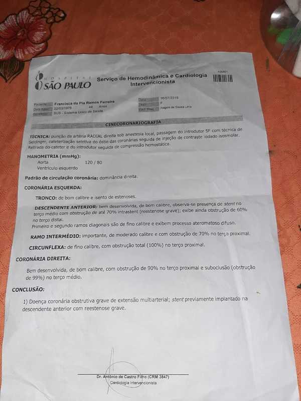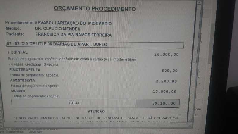 Ola, sou Ludimar, filho da Dona Francisca da Pia Ramos, que mora em Teresina - PI, na qual se encontra com problemas cardíacos. Minha querida mãe, precisa de uma cirurgia de ponte de safena o quanto antes, ela não conseguiu entrar na fila de espera para ser atendida pelo SUS, devido a isso seu quadro esta se agravando e a qualquer momento poderá ter um infarto e não sobreviver. Já foi ao hospital varias vezes com muitas dores no peito, inchaço pelo corpo, dificuldades para respirar, cansaço constante. Foi diagnosticada por médicos plantonistas que ela esta com 90% das veias do coração obstruídas. Atualmente moro em São Paulo, tenho 25 anos, sou estudante e no momento estou desempregado, moro de aluguel. Devido ao quadro da minha mãe, estou bastante preoculpado sem saber o que fazer, pois ela procurou por hospitais particulares e constatou que esse procedimento cirurgico chega a custar R$40.000,00. E no quadro que me encontro não tenho condições de arcar com o valor da cirurgia. Mediante a isso, recorro com a colaboração de todos vocês, alterei o valor pois encontrei um hospital que faz a cirurgia por um preço mais em conta.