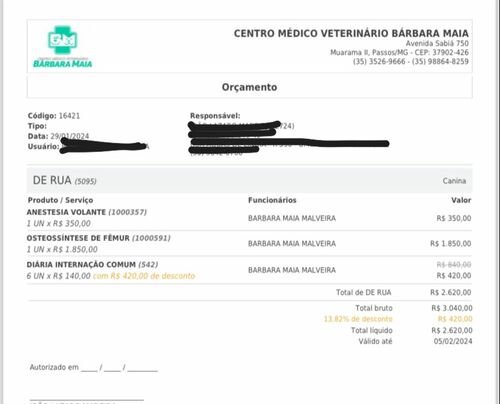 Os médico veterinários irão fazer a cirurgia e o tratamento dele com o preço de custo, então o valor já foi feito para ajudar o cãozinho. Mesmo assim é um valor que foge um pouco do meu orçamento e como ele é de rua, não tem ninguém parar arcar com tudo.