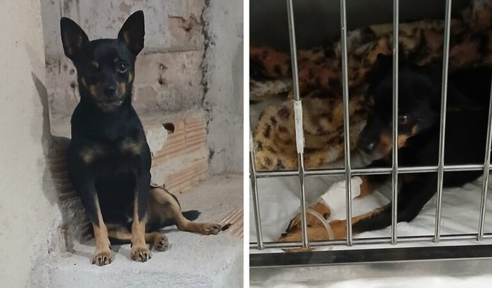 Ele está internado, só fica deitado amuado, pois não consegue se apoiar nas patas traseiras.