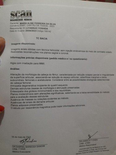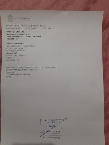Olá me chamo Aline ,estou passando por uma fase muito difícil pois venho fazendo vários exames e acompanhamento médico.Estou com um problema muito sério de cartilagem que por conta disso terei que realizar uma cirugia no quadril .E devido o valor ser muito alto ,venho caricidamente pedir ajuda de todos que poderem ,pois o valor dessa cirurgia e 85.000,00 .Eu estou na fila do SUS ,só que o retorno e quase impossível pela minha idade, sinto muita dor e por isso não ando sem a muleta ,e fora os remédios fortes que estou tomando devido a dor.Desde de já agradeço a cada um de vocês que Deus abençoe.