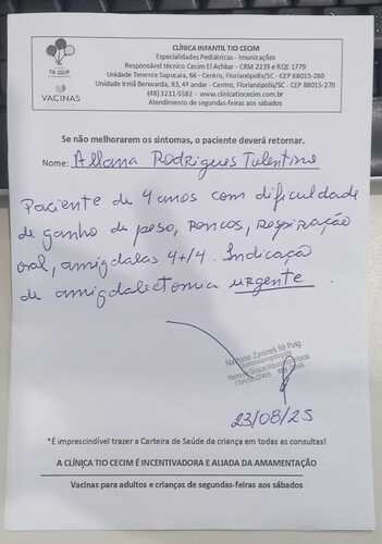 Sou a mãe da Allana de 4 anos, vou passar um relato sobre o diagnostico dela, ela esta na fila de espera a 3 anos para a cirurgia das amígdalas grau 4, no ano de 2024 ela já teve afastada por 120 dias da creche por conta de muito antibiotico este ano esta afasta por 60 dias, resolvi cria a vaquinha pois não aguento mais ver o sofrimento da minha pequena a cirurgia custa de 6 a 15 mil mais não tenho condições…