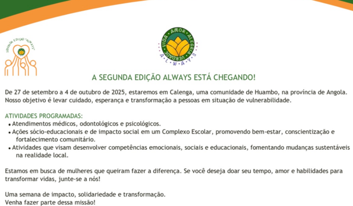 Foi quando tive a oportunidade de conhecer profissionais incríveis que fazem a diferença no mundo com seu trabalho voluntário. E foi assim que descobri o Always Ação Humanitária - Brasil e Angola. Este projeto é um verdadeiro exemplo de como o voluntariado pode ser uma poderosa expressão de amor e compaixão, transcendente fronteiras e unindo pessoas de diferentes partes do mundo.