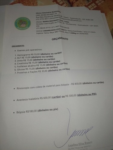 Amarelinha está com suspeita de um cancer nasal, precisa realizar alguns exames, um deles é Rinoscopia com coleta de material pra biopsia que custar R$850 e para realizar esse exame também, precisa da Anestesia inalatória que custar R$500, para realizar Biopsia R$180 e também precisar de um hemograma completo que custar R$160.