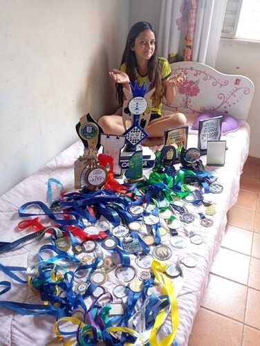 Em apenas 3 anos de dedicação ao esporte, Ana Julia já coleciona diversas medalhas e troféus — frutos de muito esforço, disciplina e paixão pelo xadrez.