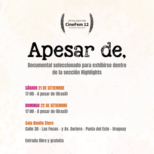 Estamos empolgadas em compartilhar que nosso documentário Apesar De, foi selecionado para um prestigiado festival de cinema no Uruguai, o CIneFem, Festival de Cinema Internacional de Mulheres! Este é um reconhecimento importante do impacto e da relevância da nossa mensagem!