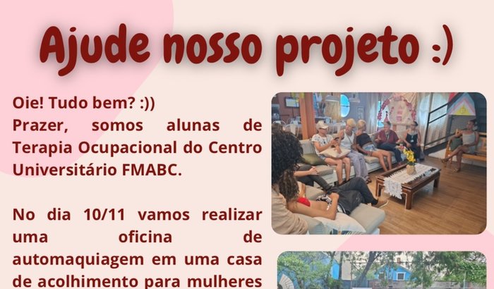 Somos alunas de Terapia Ocupacional do 4º semestre do Centro Universitário FMABC. Estamos aqui para pedir algo muito importante, e precisamos da sua ajuda! No dia 10/11, ocorrerá a Oficina de Automaquiagem no centro de acolhimento para mulheres transsexuais e travestis. A casa é pioneira no Brasil que acolhe e atende 30 mulheres transexuais e travestis.