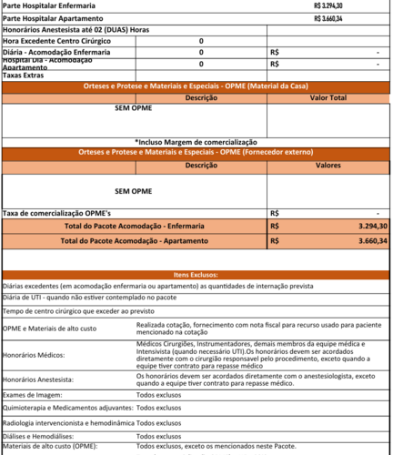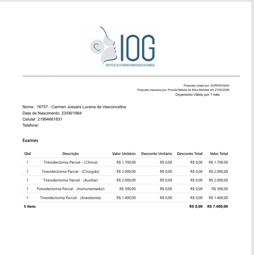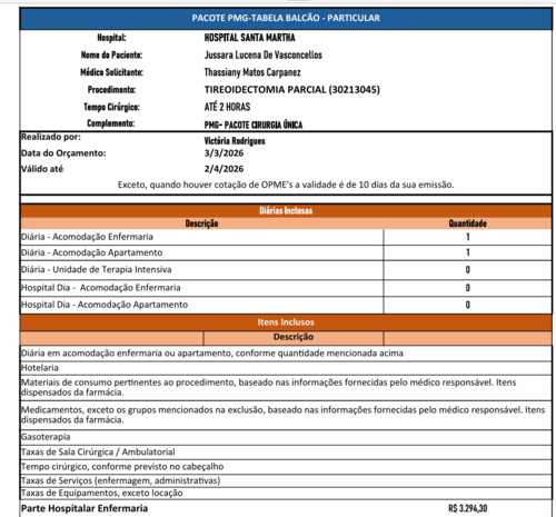 Seguindo a orientação da minha endocrinologista e de um especialista em cirurgia de cabeça e pescoço, recebi a indicação de realizar a tireoidectomia total. O procedimento inclui internação de 1 dia e encaminhamento dos nódulos para biópsia. O custo total é de R$ 12.395,00.