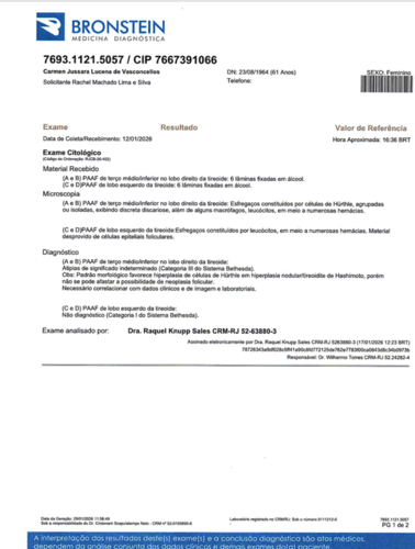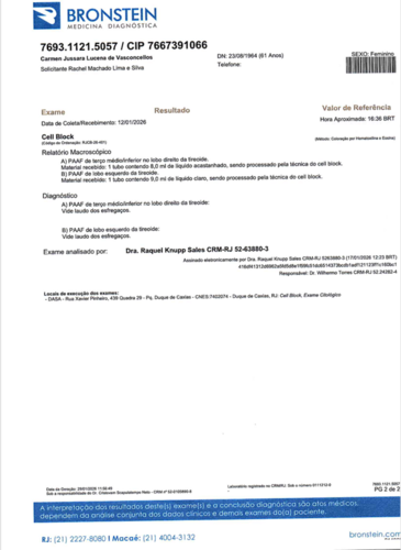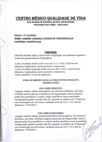 Dia 03 de fevereiro fui a consulta com a endocrinologista, que ao comparar os exames de imagem e os laudos de dezembro e janeiro, bem como os exames laboratoriais, decidiu me encaminhar para cirurgia pois não pode descartar a possibilidade de neoplasia folicular (conforme exame de jan. 2026) devido ao tamanho dos nódulos e o crescimento em curto espaço de tempo.