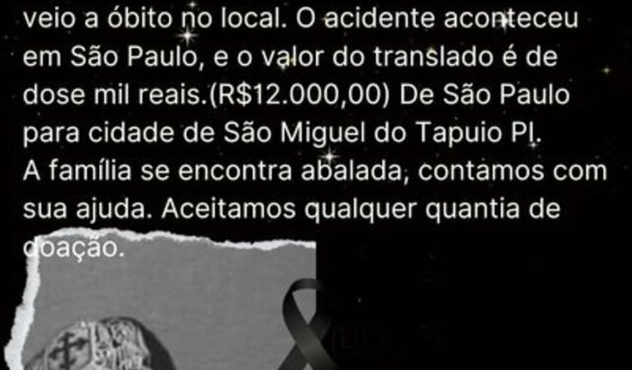 na noite de ontem em itapevi/SP, um motorista embriagado atropelou o irmão de uma amiga. a família é do Piauí, quem puder ajudar para o traslado do corpo,qualquer valor será muito bem-vindo. Obrigada