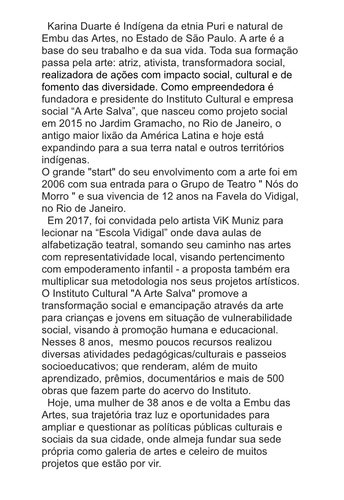 Olá!Eu sou Karina Duarte, indígena do povo Puri, nascida em Embu das Artes, na grande São Paulo. Sou atriz, idealizadora e fundadora do Instituto Cultural A Arte Salva - projeto social que nasceu no Jardim Gramacho, antigo maior Lixão da América Latina, que existe há 8 anos e segue em processo de crescimento, transformação e expansão.Com muita luta, orgulho e honra fui selecionada para participar, em Abril, do Brazil Conference at Harvard & MIT através do programa Brasil Cultura em Ação - que tem como objetivo mostrar ao mundo a capacidade que a Arte e a Cultura Brasileira têm de expressar e promover questões sociais importantes. Considerando que o evento paga todas as despesas iniciais dos participantes, criei essa vakinha em busca de apoio para minha performance ao longo do evento, bem como vestimenta, alimentação, estrutura e todo material para captação digital, além da organização de todo o material sobre minha trajetória que precisará ser exibido na minha performance individualEssa oportunidade será um divisor de águas na minha história, a realização de um sonho e quero muito poder contar com corações empáticos e a colaboração de todos que acreditam em um futuro mais justo e igualitárioToda minha gratidão desde já,Karina Duarte