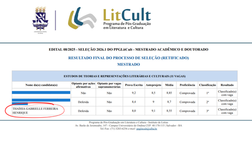 Oi, gente! Me chamo Thaíssa, recém graduada em Letras, e estou muito feliz em compartilhar uma conquista importante: fui aprovada no Mestrado do Programa de Pós-Graduação em Literatura e Cultura da UFBA. Por isso, estou me mudando de Imbassaí (BA) para Salvador para iniciar essa nova etapa.