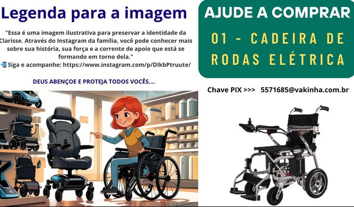 Essas cadeiras costumam ter um custo alto, e por isso venho pedir a sua colaboração. Toda doação — seja qual for o valor — fará uma enorme diferença. Se você não puder contribuir financeiramente, compartilhar minha história com outras pessoas já é uma grande ajuda.