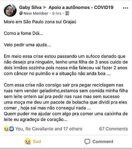 Diariamente tenho me deparado com relatos como esse, da Gaby, que está passando fome, por ser catadora de lixo e não estar conseguindo exercer sua profissão durante a quarentena.