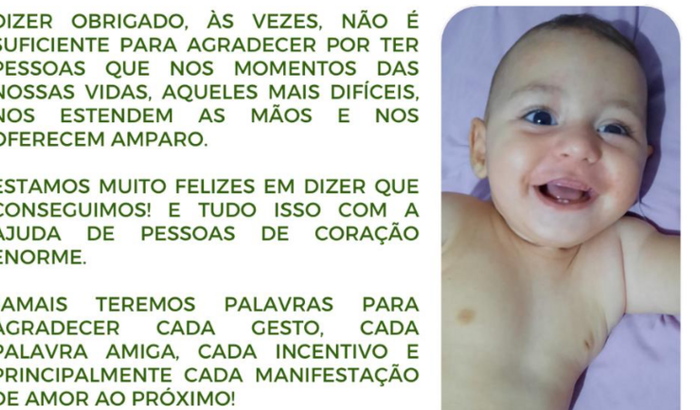 CONSEGUIMOS! Não imaginávamos e não tínhamos a dimensão que chegaríamos tão rápido no nosso objetivo. E, tudo isso, com o apoio de vocês. Queremos agradecer as pessoas maravilhosas que nos ajudaram neste momento tão difícil e delicado. Estamos muito felizes em saber que nosso Arthur terá amparo. Seremos eternamente gratos. Com carinho, mamãe Bruna e papai Ricardo.