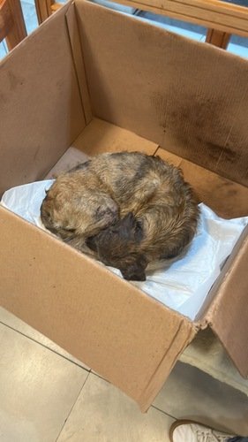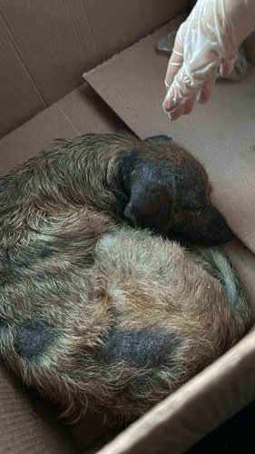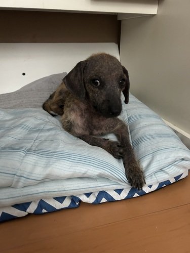 Resgatei ele na porta da clínica da família Helena Besserman no dia 19/03 quando estava indo embora. Ele estava bem emagrecido, com doença de pele visível e assustado. Levei ao veterinário no mesmo dia, fizemos exames e iniciamos tratamento para sarna demodécica, doença do carrapato, verminose, anemia e emagrecimento.